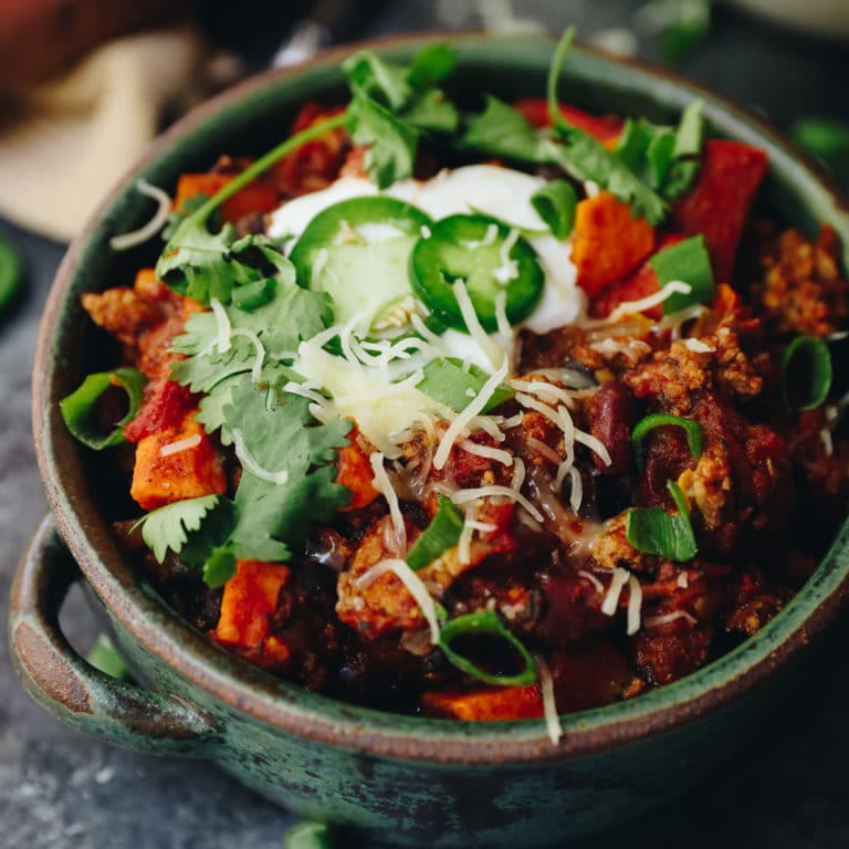 Lightened-up chili using ground turkey and sweet potato! This Sweet Potato Turkey Chili can be made in one-pot and will feed you all fall and winter long for dinner or lunches alike.