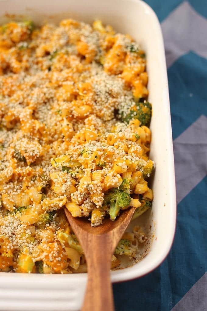 This creamy baked mac and cheese recipe is a lightened-up version of a classic dinner favorite. Loved by both parents and kiddos alike this easy macaroni and cheese recipe is both health and comfort in a bowl.