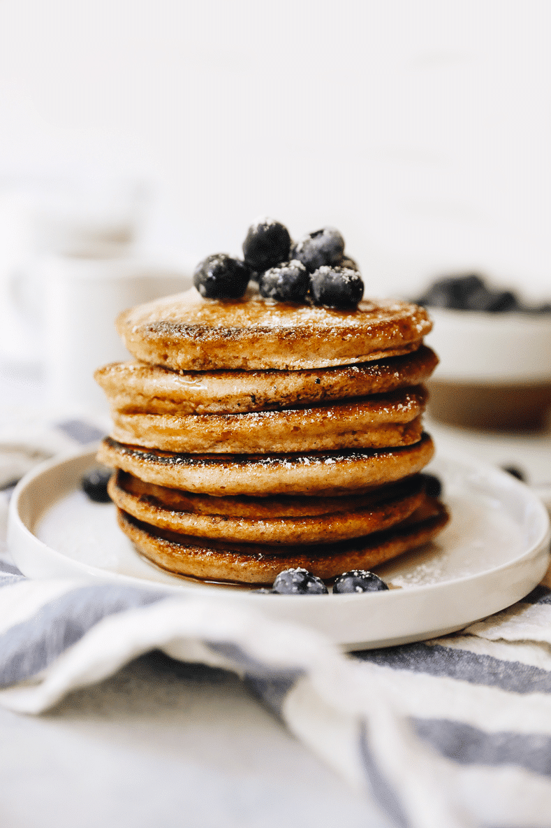 1. Don’t overmix!!! I can’t stress this enough. Once your wet ingredients are incorporated into your dry ingredients, stop whisking! It’s tempting to keep going but the gluten from the whole wheat flour will strengthen and this will make a more bread-like pancake instead of a fluffy pancake.